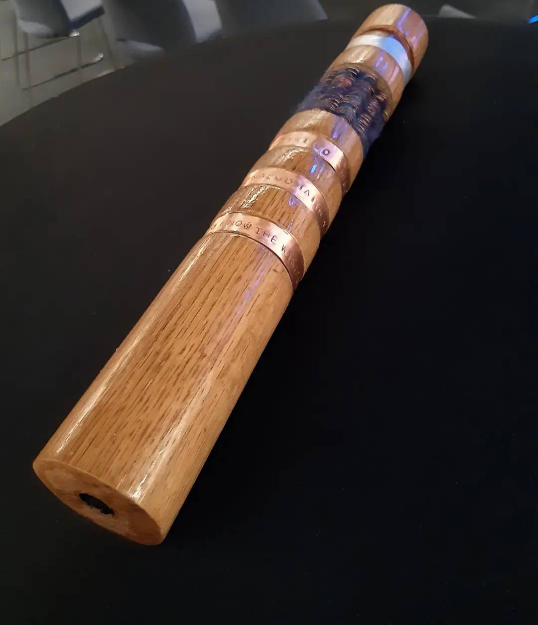 The Baton is made of oak wood, with an aluminum metal insert with the outline of the mountains of Snowdonia cut out, through which is decorated Welsh wool.