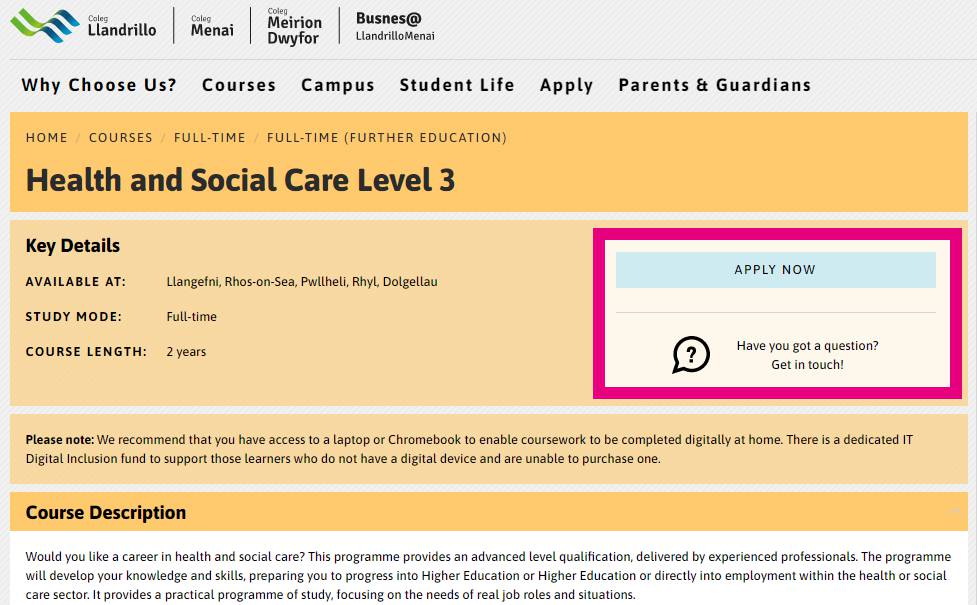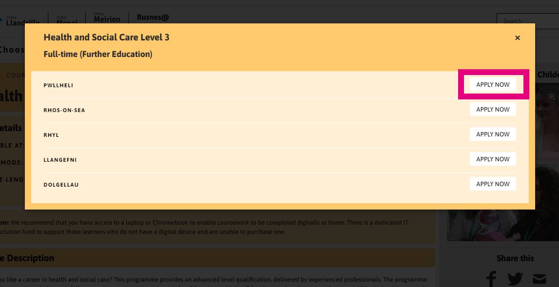 2. I wneud cais, cliciwch ar 'Gwneud Gais' ar unrhyw daflen cwrs