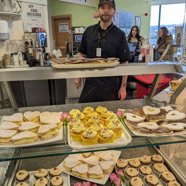 Two members of the catering staff created batches of freshly-baked, heart-shaped shortbreads, cupcakes and chocolate biscuits, much to the delight of staff and students.