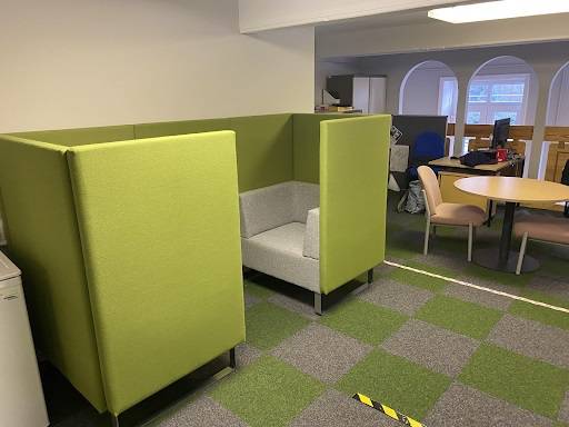 The pods are officially available for all learners to access, but are mainly for students with Autistic Spectrum Disorder (ASD) or Behavioural, Emotional and Social Difficulties (BESDs). There are a combination of 2 and 4-seater pods (green and grey in colour), and they were funded by a Covid well-being grant from the Welsh government.