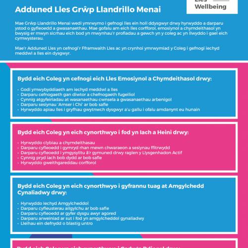 During this week’s Wellbeing enrichment activities, Grŵp Llandrillo Menai will be promoting all of the services and supporting resources available to its learners to ensure that they are provided with the highest quality experience in a healthy and a safe environment, whilst completing their studies.